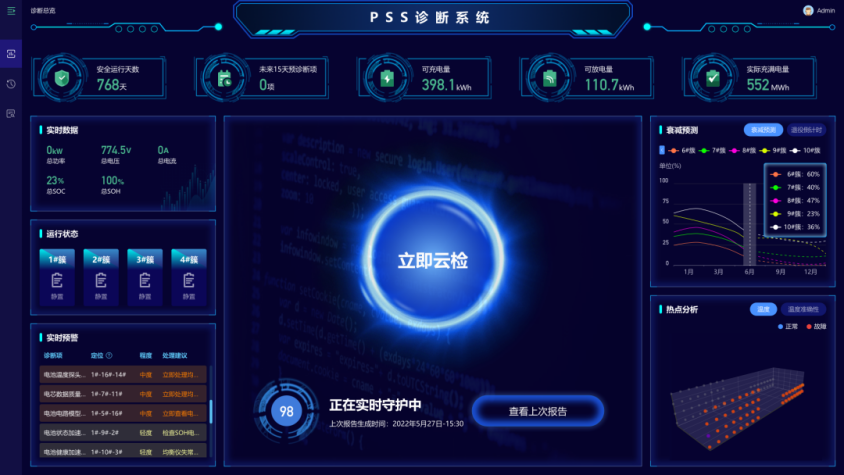 PSS作为电池清静领域的标杆系统,可以为每节电芯提供全生命周期效劳,“血液级”安检评估与精准运维,荟萃智能诊断、恒久展望、运维指南等功效,将“预防做到消防前”,为储能全工业链赋能。